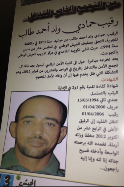 و حمادي ولد أحمد طالب هو من مواليد 1973 في المجرية، التحق بالجيش في 15 مارس 1994 و بعد تخرجه انتقل لكتيبة الأمن الرئاسي “بازب” ليتم تحويله منها إلى تجمع الأمن و التدخل في 21 فبراير 2012 أي قبل قرابة ثمانية أشهر على وفاته و محاولة اغتيال ولد عبد العزيز.